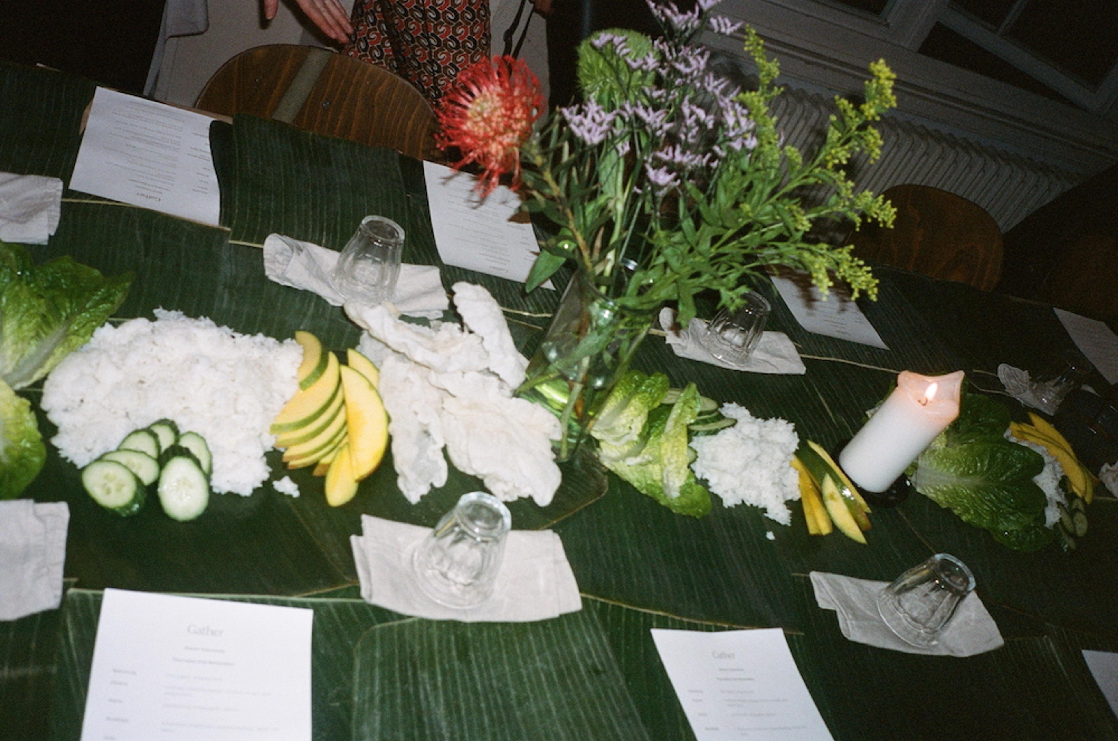 Im November veranstaltete Gather ein Abendessen der philippinisch-amerikanischen Künstlerin Alexis Convento, dessen kulinarisches Projekt Ulam sich der Dekolonisierung von Essen und der Überwindung von Systemen westlicher Dominanz verschrieben hat. Eine der ersten Kreationen von Ulam war ein Fünf-Gänge-Menü, dessen Zutaten von der Manila-Galeone Handelsroute inspiriert waren – jener Route, die es der spanischen Kolonialmacht ermöglichte, Waren aus dem asiatischen und pazifischen Raum zu importieren – , womit Ulam die Verbindung zwischen den Phillipinen und Mexiko zuückverfolgte. Als Convento 2019 von New York nach Berlin zog, begann sie philippinisches Essen in einem neuen Kontext zu entdecken. „Als ich nach Deutschland kam, wo die Geschmackspalette eine völlig andere ist, spürte ich plötzlich dieses Verlangen – ich wollte Chicken Adobo, ich wollte Lumpia Shanghai, ich wollte all das, was ich hier nicht so einfach in einem Restaurant bekommen konnte. Natürlich lernt man dann, wie man diese Dinge selbst herstellen kann.“ Während des Lockdowns trieb sie eauf den Berliner Märkten so viele philippinische Zutaten wie möglich auf. Inzwischen weiß sie, wo man frische Calamondinorangen und Kokosnussessig finden kann. Und manchmal, so erzählt es Convento, geht sie nicht mehr auf den Markt, um eine Zutat zu suchen, sondern bereitet sie einfach selber zu, wie zum Beispiel ihr eigenes Bananenketchup, eine Abwandlung von Tomatenketchup, die im Zweiten Weltkrieg populär wurde, als die Philippinen noch ein US-Territorium waren.