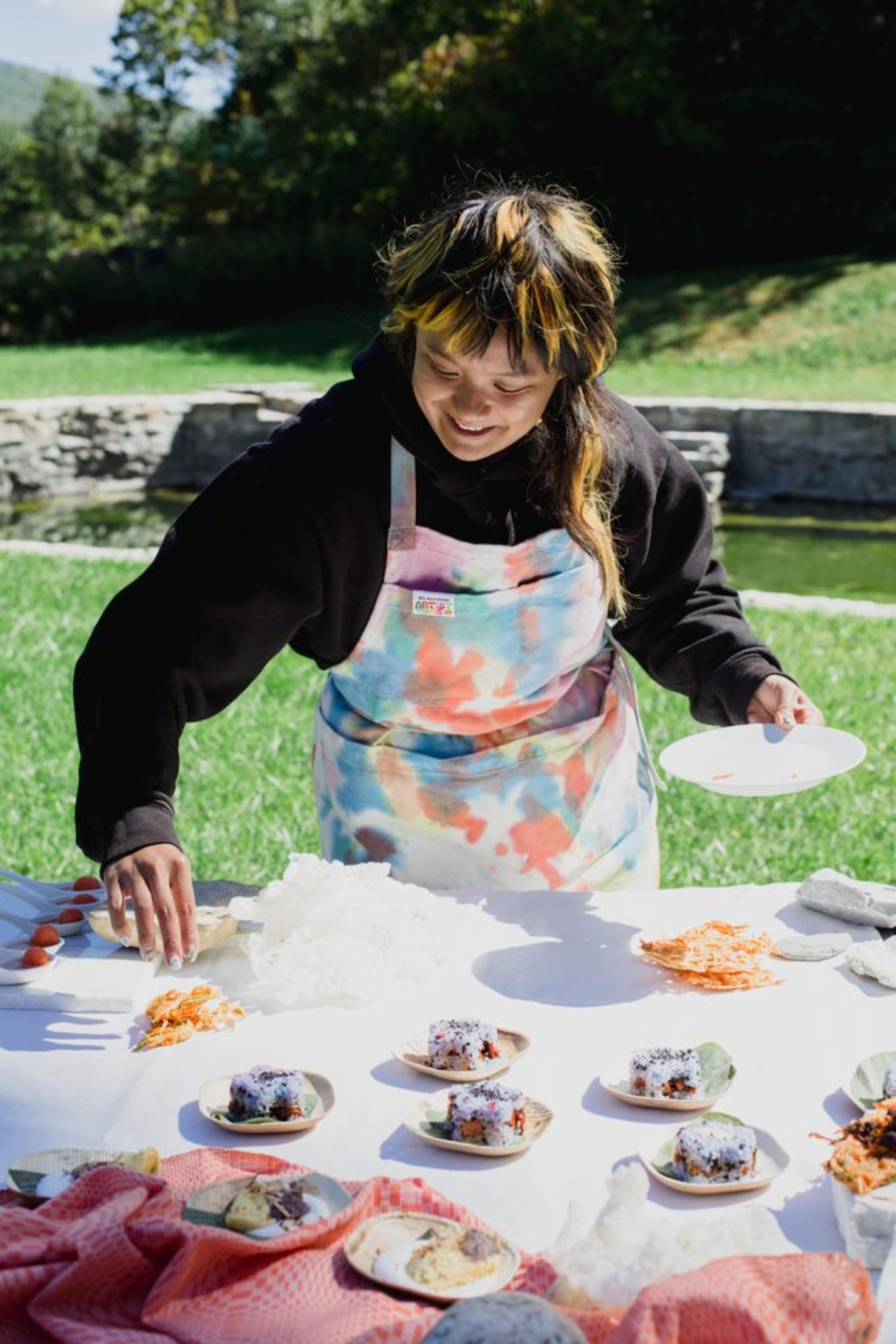 Diese Art und Weise, zwischen den Kulturen zu navigieren, spiegelt sich in ihren kulinarischen Kreationen wieder. So präsentierte sie zusammen mit Gather in der Orangerie ein Dinner, inspiriert von Kamayan, einem traditionellen philippinischen Festmahl, das die Gäste mithilfe ihre Hände essen. „Mir gefällt die Idee, die Formalität eines Tellers aufzubrechen und das Essen vielmehr zu einer spielerischen Erfahrung zu machen“, erzählt Convento. Es ist diese Flexibilität, die einen der zentralen Unterschiede zwischen einer kulinarischen Künstlerin und einem Koch darstellt. „Eine Köchin scheint mir doch sehr festgelegt und kalkuliert zu sein, denn das zuzubereitende Gericht ist häufig genau dasselbe, wie schon vor fünf Monaten. Ich weiß nicht, ob ich dazu in der Lage wäre.“ Convento, die aus dem Tanz und der Performance kommt, betont, dass Improvisation und Intuition eine große Rolle in ihrer kreativen Arbeit spielen. „Ich lasse zu, dass sich die Aromen jedes Mal ein wenig verändern, je nachdem, was gerade verfügbar ist oder wie ich mich an dem Tag fühle.“